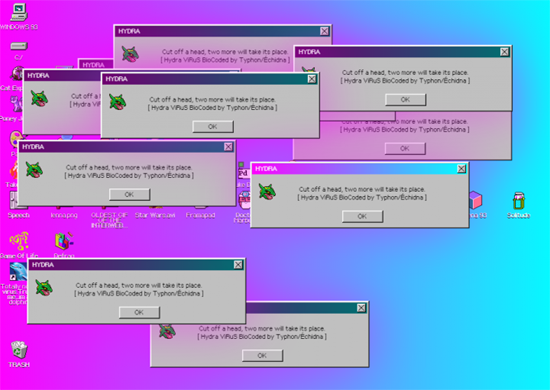 Есть в Windows 93 и свой вирус под названием Hydra.exe (вероятно, отсылка к одноимённому мему). По нажатию на эту иконку пользователя начинают закидывать всплывающими окнами, закрытие каждого из которых порождает ещё два новых.