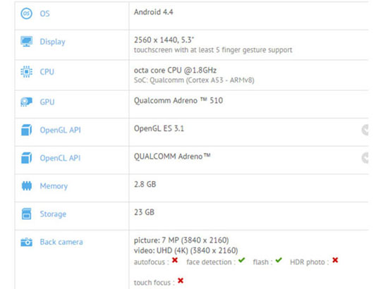 Устройство, если верить источнику, оснащено 8-ядерным процессором Snapdragon 652 с тактовой частотой 1.8 ГГц, графическим процессором Qualcomm Adreno 510 и 5.3-дюймовым дисплеем с разрешением 2560 x 1440 пикселей.