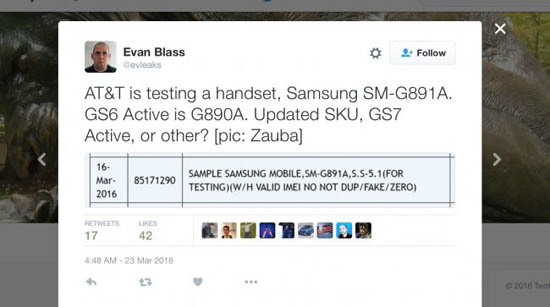 Учитывая тот факт, что прошлогодний Galaxy S6 Active носит номер модели SM-G890A, мы можем предположить, что новая модель может быть не что иное, как Galaxy S7 Active. Смартфон должен быть более устойчивым к физическому воздействию и, возможно, получит более емкий аккумулятор, чем обычный Galaxy S7.