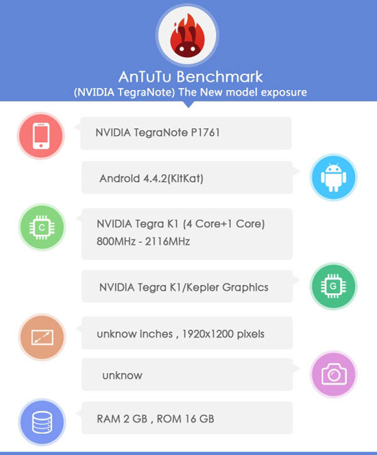 В январе NVIDIA показала несколько эталонных дизайнов планшета с 4 Гбайт оперативной памяти и новой однокристальной системой Tegra K1. Однако недавно в базе данных тестового пакета AnTuTu засветился планшет NVIDIA Tegra Note с кодовым именем P1761, который при том же чипе Tegra K1 получил 2 Гбайт оперативной памяти.