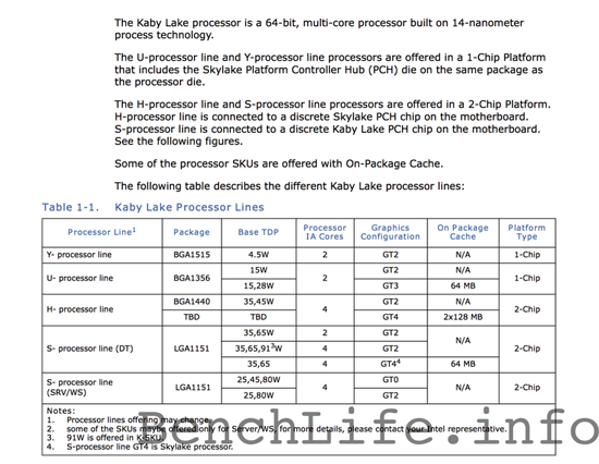 Семейство Kaby Lake будет включать в себя двух- и четырёхъядерные чипы, дополненные графическим ядром нового поколения. Новые процессоры получат двухканальный контроллер памяти и до 256 Мбайт кеша L4 (eDRAM), устанавливаемого на подложку отдельным кристаллом, как это сделано сейчас в Broadwell-C. Номенклатура Kaby Lake будет широкой и затронет как настольный, так и мобильный сегменты рынка. Об этом говорит и широкий диапазон теплопакетов — от 4,5 до 91 ватта.