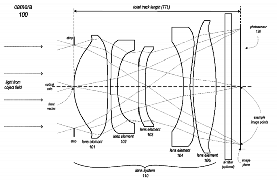 В документе описан объектив с общей толщиной 6 мм и фокусным расстоянием 7 мм. Параметр под названием «телеувеличение» в этой конструкции соответствует значениям 0,74 и 1,0. Диафрагма, чтобы считаться телеобъективом, должна быть на уровне ƒ/1,0 или меньше. В некоторых вариантах телеобъектив может быть оснащён регулируемой диафрагмой или апертурой, которая позволит устанавливать число диафрагмы на уровне от 2,4 до 10,0. В остальном новая конструкция ничем не отличается от стандартных цифровых камер.
