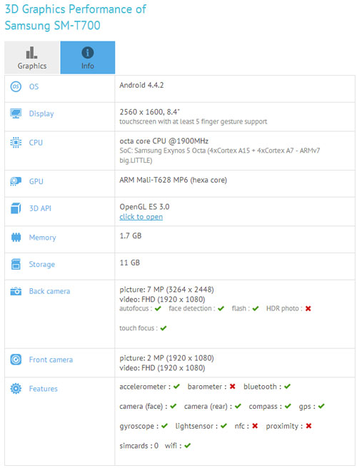 В этом же бенчмарке появились и ещё два планшета Samsung - SM-T700 и SM-T230. В первой новинке стоит 8,4-дюймовый экран с разрешением 2560 x 1600 точек, а во второй используется 7-дюймовый тачскрин с разрешением 1280 x 800 пикселей, который дополняют 4-ядерный процессор Cortex-A7 с частотой 1,4 ГГц и графикой Mali-440MP4. Процессор Wi-Fi only и 3G-версий планшета работает на частоте 1,2 ГГц.