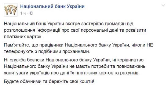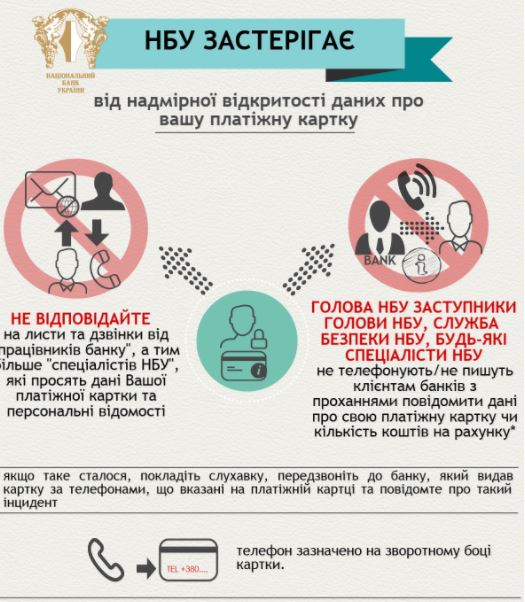 "В последнее время все чаще кибермошенники звонят пользователям платежных карточек, называясь представителями Национального банка Украины и требуя назвать конфиденциальную информацию о реквизитах платежных карт, суммы остатков на счетах или пароли к интернет-банкингу и тому подобное", - говорится в нем.