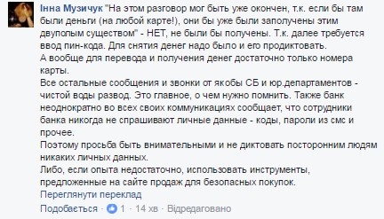 Музычук также напомнила, что "сотрудники банка никогда не спрашивают личные данные - коды, пароли из смс".