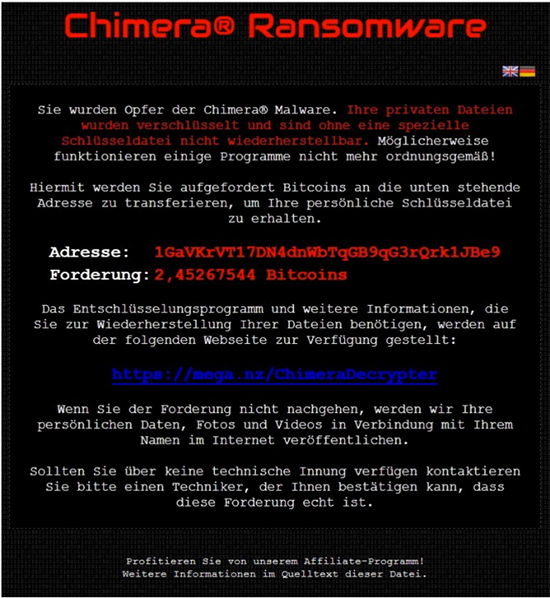 «После того, как жертва перешла по ссылке и загрузила Chimera, файлы на компьютере и сетевых дисках шифруются и требуется выкуп за расшифровку в размере 2,45 биткоиногв (около $ 694). В отличие от других видов грабительских ПО, пользователь предупреждается о том, что в случае неуплаты его данные будут опубликованы в интернете. Тем не менее, эксперты уверены, что эти угрозы - не более чем блеф, целью которых является устрашение жертв», - передает пресс-служба киберполиции.
