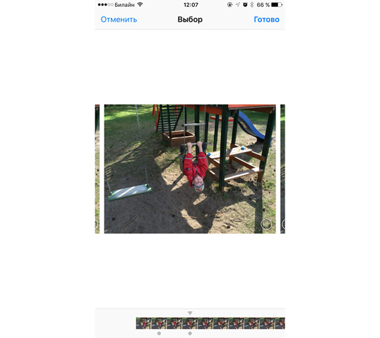 В iPhone 6 есть опция серийная съемка, которая позволяет камере снимать с частотой 10 кадров в секунду. После этого камера анализирует каждый снимок и выбирает лучший. Обычно она делает это хорошо, однако вы сделаете это лучше. Чтобы лично просмотреть все отснятые кадры, нажмите на “Выбрать….” в нижней части экрана и, собственно, смотрите сами на сделанные кадры. Та, что iPhone выбрал сам, будет помечена серой точкой, однако вам никто не мешает сделать свой выбор, просто отметив нужное фото. Или “нужные фоты” — вы можете сохранить хоть все.