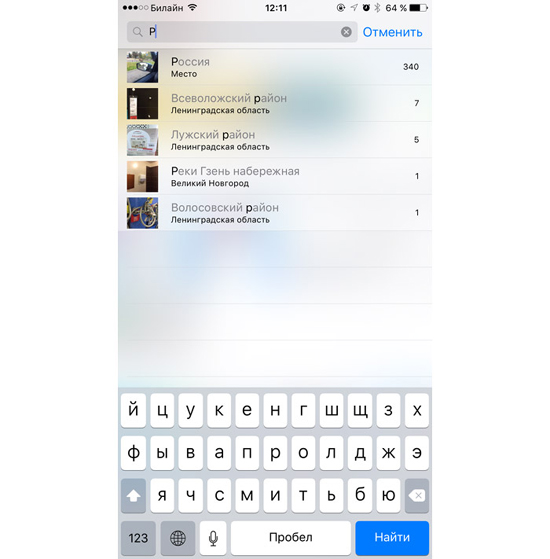 В приложении Фото можно искать — по дате, по имени, если вы включили распознавание лиц и по месту съемки, если вы включили опцию сохранения координат съемки. Просто в режиме просмотра альбома нажмите на иконку поиска в правом верхнем углу и ищите.