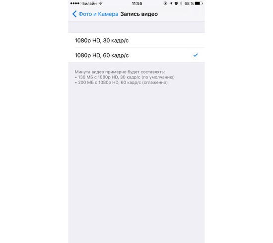 По умолчанию видео в iPhone 6 пишется с частотой 30 кадров в секунду, однако камера способна и на 60. Чтобы включить 60 к/с, пройдите в Настройки —> Фото и Камера —> Записать видео с 60 кадр/с. Если при записи видео в правом верхнем углу видна надпись 60 fps, значит вы все сделали правильно. Зачем записывать видео в 60 кадр/с? Хотя бы потому, что у человеческого глаза нет никаких «кадров в секунду» и для него чем в видео этих кадров больше, тем лучше. Когда-нибудь мы доживем и до роликов на YouTube со 150 кадр/с.