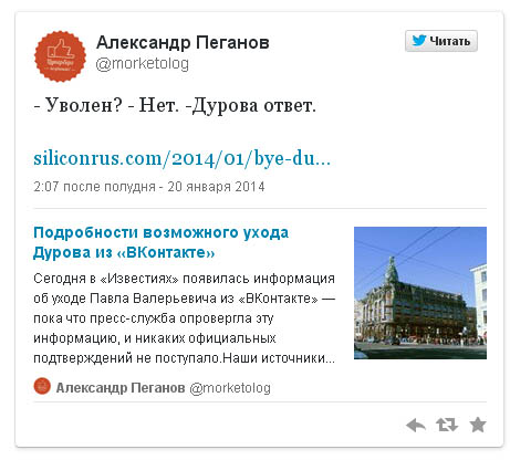 Сегодня днем газета «Известия» выпустила статью с заголовком «Павел Дуров покидает пост гендиректора "ВКонтакте"». В статье сообщалось следующее: