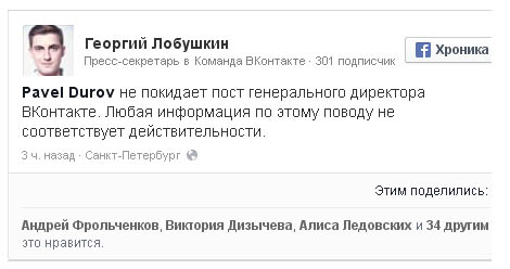 Лобушкин, вопреки сообщению в газете, от комментариев не отказывался, а сразу написал в Facebook, что Павел Дуров не покидает пост генерального директора «ВКонтакте».