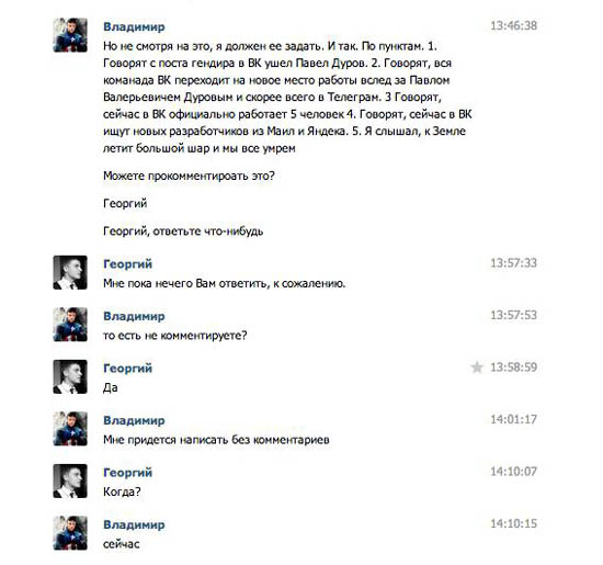 Косвенно то, что все не так просто и, возможно, Дурову действительно придется уйти, подтверждает скриншот переписки пресс-секретаря сети и журналиста «Известий»: