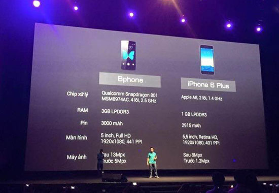 В ходе презентации представители компании Bkav неоднократно обращались к iPhone 6, сравнивая BPhone с «яблочным» флагманом, у которого «всего 1 ГБ оперативной памяти и 8-мегапиксельная камера».