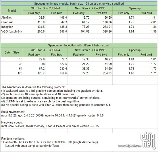 В ходе данного бенчмарка через видеокарты прогоняют ряд вычислений и смотрят, насколько быстро она их выполняет. Результаты старого поколения видеокарт сведены в столбец «Old Titan X + CuDNN4», нового — в «New Titan X + CuDNN5». Выяснилось, что Pascal справляется с вычислениями как минимум в 1,71 раза эффективнее. В некоторых тестах видеокарта достигла двукратного превосходства над старой версией. Для тестов использовался компьютер с процессором Intel Cote i5-4570 и 16 ГБ ОЗУ.