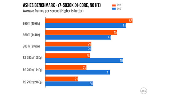 «Оптимизация под DirectX 12 — более хитрый зверь. API дает разработчикам намного больше контроля в управлении ресурсами, что делает всею работу Nvidia над DirectX 11 бессмысленной. Или, вероятно, это стало следствием решения оптимизировать работу видеокарт под DirectX 11, в то время как AMD обратили свой взор на параллельную обработку».