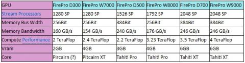 Согласно источникам среди китайских компаний-поставщиков комплектующих, графические чипы серии D могут поставляться для Apple эксклюзивно и не попасть в состав других устройств. Именно это может объяснить тот факт, что AMD до сих пор не торопилась анонсировать данный продукт. В таблице представлены технические характеристики данных карт серии D и их сравнение с моделями семейства FirePro серии W.