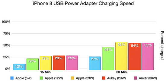 Журналисты провели замеры быстрой зарядки в течение 15-минутного и 30-минутного промежутков. Все тесты проводились с помощью 64-гигабайтного iPhone 8. Был включен «Авиарежим», все приложения были закрыты, а яркость экрана выкручена на 50%.