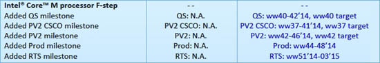 Изначально планировалось, что отгрузки Core M начнутся в период с 37-й по 40-ю неделю 2014 года, то есть в промежуток между 8 сентября и 5 октября. Однако теперь сообщается, что окно выхода процессоров изменено: их релиз ожидается в период с 51-й недели 2014-го по 3-ю неделю 2015 года (с 15 декабря по 18 января).