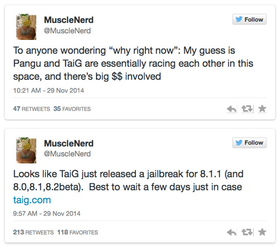 «Похоже, TaiG только что выпустили джейлбрейк для iOS 8.1.1 (и iOS 8.1, 8.1, 8.2 beta), – пишет MuscleNerd. – Лучше, конечно, пару дней подождать, пока все станет ясно».