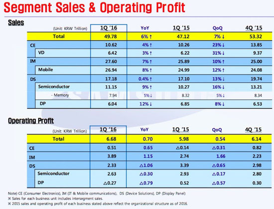 Квартальная выручка Samsung выросла на 5,7% до 49,8 трлн. вон. Операционная прибыль за первый квартал составила 6,7 трлн. вон ($5,84 млрд.). Чистая прибыль за период равнялась 5,26 трлн. вон ($4,6 млрд.). Смартфоны принесли компании существенные дивиденды. В годовом отношении квартальная выручка от продаж смартфонов увеличилась на 42% до 3,9 трлн. вон. В Сеуле ожидают, что спрос на модели аппаратов последнего поколения продолжится во втором квартале и, не в последнюю очередь, за счёт выхода бюджетных моделей серий Galaxy A и J.