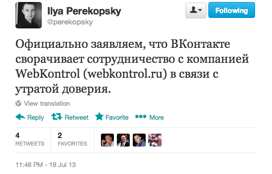 Илья Перекопский объявил в своем твиттере о прекращении сотрудничества "Вконтакте" с системой мониторинга авторского контента Webkontrol, которая до этого могла самостоятельно отключать контент, нарушающий права правообладателей-клиентов Webkontrol:
