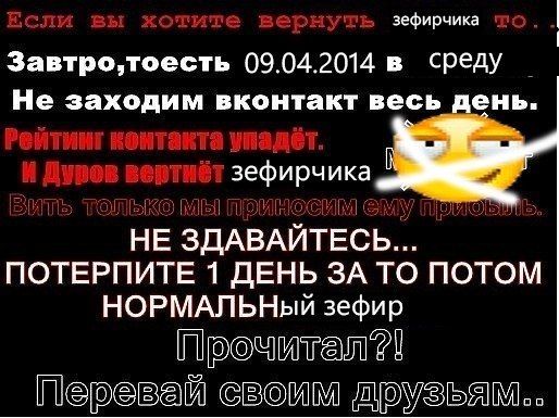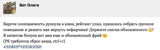 Олег прикрепил к своему сообщению тег #ЗефирчикЖиви, тем самым поддержав шуточный флешмоб, развёрнутый поклонниками Зефирчика. В результате этого флешмоба в соцсети за сутки появилось несколько десятков фотожаб, пользователи ставили Зефирчика с траурной ленточкой на аватарки личных страниц и предлагали «не здаваться» и сутки не заходить в соцсеть, чтобы упала её посещаемость.
