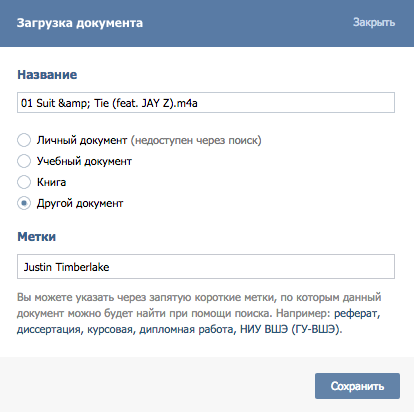 Загрузка в документы музыкальных файлов других форматов (например, m4a, использующийся для песен в магазине iTunes Store) по-прежнему доступна без ограничений. Песни в формате mp3 можно добавлять в раздел аудиозаписей, однако в нём работает фильтрация: если запись была изъята по требованию правообладателей, повторно загрузить её нельзя.