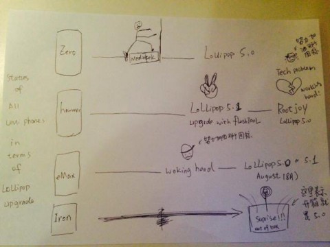 На официальной странице UMi в Facebook появилась нарисованная от руки "дорожная карта", с помощью которой можно понять, какие устройства компании получат обновление до 5-й версии Android, а какие останутся "за бортом". Для владельцев продукции от UMi есть как хорошие, так и плохие новости. Так, из-за ограничений процессора MediaTek представленный в прошлом году смартфон UMi Zero не сможет обновиться до Lollipop, а значит новым покупателям будущих моделей от UMi в этом смысле повезло.