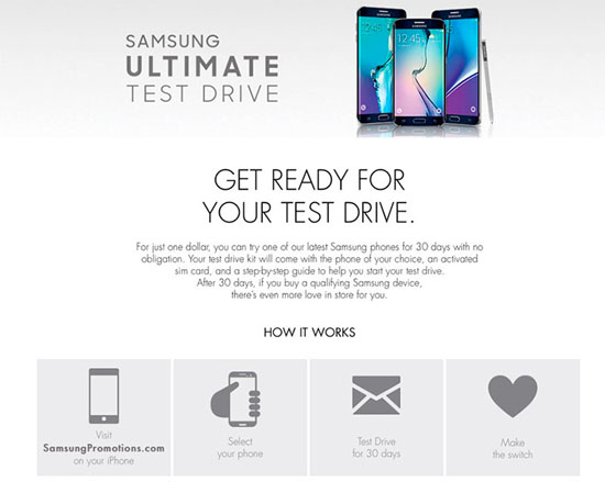 Программа южнокорейского производителя была интересна тем, что предлагала владельцам iPhone всего за 1$ взять на месячный тест-драйв один из новых корейских коммуникаторов. Эта промоакция, получившая название Samsung Ultimate Test Drive, действовала лишь на территории Соединенных Штатов при поддержке ряда крупнейших мобильных операторов.