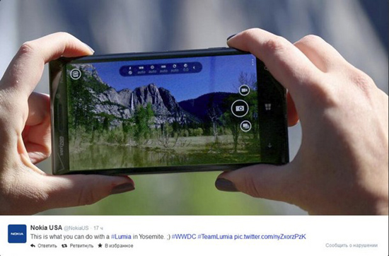 Очевидно, что американское подразделение Nokia специально готовилось к яблочному мероприятию. Не на руку Apple оказались и многочисленные предрелизные утечки — Крейг Федериги до последнего удерживал интригу, рассказывая со сцены Moscone West, как сотрудники Apple колесили по Калифорнии в поисках названия для OS X, а конкуренты уже демонстрировали в своем твиттере пейзажи национального парка Йосемити и, в частности, скалы Эль-Капитан, отснятые на Nokia Lumia 1020.