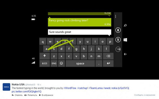 Не обошли вниманием и новую виртуальную клавиатуру iOS 8 QuickType с функцией предиктивного ввода, которая, по мнению сотрудников Nokia, существенно уступает WordFlow из Windows Phone;