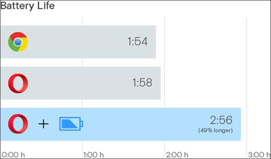 Opera утверждала, что новая функция способна продлить время работы ноутбука на 50 % по сравнению с ранними версиями её собственного браузера, а также по сравнению с Chrome. Ниже на картинке показано, как выглядел сравнительный тест браузеров, продемонстрированный Opera в мае. Судя по нему, с тех пор Chrome также стал более энергоэффективным.