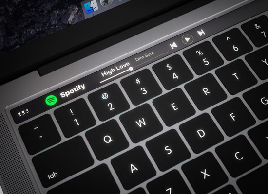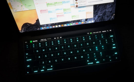 Как видно на изображениях, вся верхняя панель MacBook Pro заменена сенсорными клавишами. В зависимости от запущенного на компьютере приложения там отображаются функциональные клавиши. К примеру, если пользователь слушает музыку в Spotify, на панель выводится иконка приложения, название композиции, слайдер для регулировки громкости, клавиши для управления воспроизведением. Если используется торрент-клиент Transmission, панель демонстрирует полоску загрузки и название активной закачки.