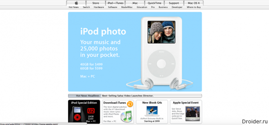 Сайт Apple выглядел 10 лет назад совсем по-другому. В первую очередь, нельзя не заметить явную адаптацию под экраны с соотношением сторон 4:3. Также, взглянув на главную страничку, которую по праву можно считать пиром для скевоморфистов, можно видеть, какие продукты в 2004 продвигала Apple. iPod, на тот момент, был главным делом компании.