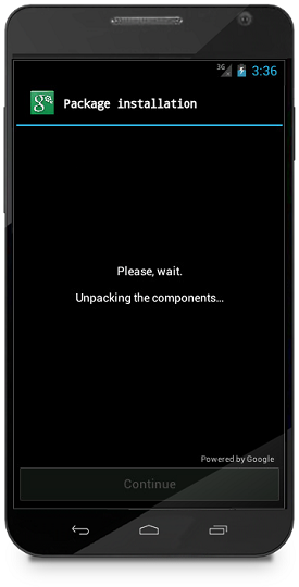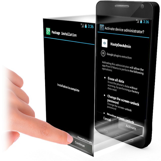 Если жертва поверила и начала установку, вредонос переходит к следующей фазе: применяет технику clickjacking. Поверх модального окна, в котором приложение запрашивает привилегии администратора, выводится еще один popup. Второе окно, которое и видит пользователь, на самом деле является сообщением об ошибке (TYPE_SYSTEM_ERROR). Старые версии Android позволяют отобразить ошибку поверх всех окон и даже поверх окна, запрашивающего разрешения для приложения. Но это сообщение об ошибке выглядит как экран установки приложения, который сообщает жертве, что установка уже началась и нужно немного подождать. Затем текст меняется, появляется сообщение о том, что установка приложения успешно завершена, а также кнопка «Continue».