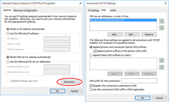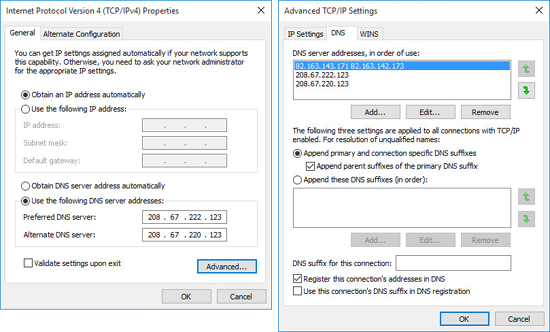 Избавиться от подложных DNS-адресов, к счастью, нетрудно. Как было сказано выше, достаточно открыть окно с настройками TCP/IP, нажать на кнопку «Advanced» и перейти во вкладку DNS. В этой вкладке адреса, заданные DNS Unlocker можно поочередно удалить.