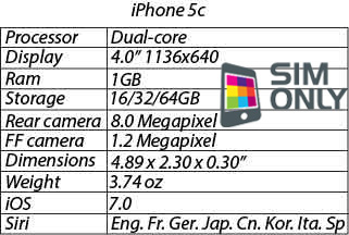 По слухам iPhone 5C является точной копией iPhone 5 в пластиковом корпусе: 4-дюймовый LCD дисплей с разрешением 640 × 1136 пикселей, двухъядерный процессор A6, 1 ГБ оперативной памяти. Смартфон также будет оснащен двумя камерами — основной, 8-мегапиксельной и фронтальной с разрешением 1,2 Мп. Объём внутренней памяти — 16, 32 или 64 ГБ. Ёмкость батареи пока неизвестна, но вряд ли она будет отличаться от 1440 мАч, что у iPhone 5.