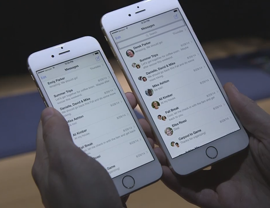 А живые видео аппарата свидетельствуют, что и в вертикальном положении экран «плюсовой» версии способен отображать несколько больше данных, чем 4.7" дисплей. В частности, вот интерфейс работы с сообщениями: iPhone 6 Plus показывает аватары пользователей, на iPhone 6 они не видны:
