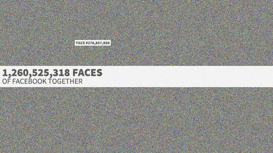 Изображение на сайте The Faces of Facebook интерактивно: можно щелкнуть на какую-либо точку и узнать, какой пользователь за ней скрывается. Все 1,2 млрд аватарок выстроены в хронологическом порядке регистрации аккаунтов в соцсети.