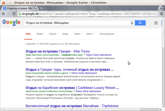 Представим ситуацию. Вы решили поехать отдыхать на острова. И вы совсем не хотите на Мальдивы. И вот чтобы Google не показывал их в результатах поиска, нужно просто ввести «Отдых на островах -Мальдивы». То есть перед словом Мальдивы поставить минус.