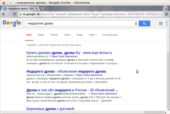 Если вы такой же ленивый, как и я, то вам не хватает терпения гуглить несколько раз по разным синонимам одного слова. Например, дешёвые дрова. Символ «~» может значительно упростить вам жизнь. Пишем «~дешёвые дрова» и получаем результаты по словам «дешёвый», «недорогой», «доступный» и т. д.