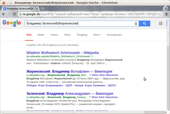 Бывают ситуации, когда вам нужно найти информацию, касающуюся двух людей сразу. Например, вы хотите посмеяться над Вовой. Но вот не решили над каким — Зеленским или ещё каким-нибудь. Достаточно ввести «Владимир Зеленский|Жириновский», и вы получите нужный вам результат. Вместо символа «|» можно вводить английское OR.