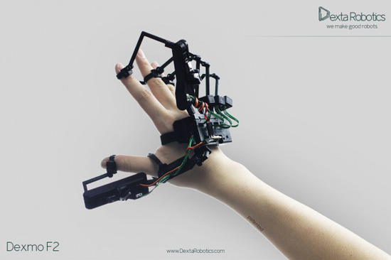 Компания Dextra Robotics работает над прототипом специальной перчатки-экзоскелета Dexmo F2, которая устроена таким образом, чтобы создавать определённое сопротивление движениям пальцев человека, если он прикасается к некоему виртуальному предмету. Специальные приводы крепятся к каждому из пяти пальцев руки, и как только перчатка получает от компьютера сигнал о том, что человек касается какой-либо поверхности, приводы начинают тянуть пальцы в обратную сторону. Разумеется, перчатка отслеживает мельчайшие движения ваших пальцев в пространстве и координирует их в соответствии с отображением вашей руки в виртуальной реальности.