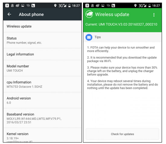 Китайский производитель смартфонов UMi выпустил второе OTA-обновление для смартфона UMi Touch, которое, как и предыдущий апдейт, также основано на Android 6.0 Marshmallow. В сборке под кодовым номером UMITOUCH.V3.03_20160409 разработчики уделили особое внимание автономности UMi Touch, а также исправили и улучшили работу камеры. Установить обновление можно в разделе О телефоне → Обновление ПО в настройках смартфона.