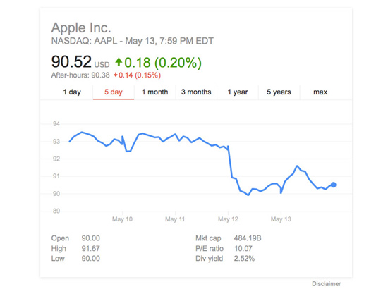 Акции Apple всегда были привлекательным вложением средств, однако с конца апреля, когда компания сообщила о падении продаж iPhone и первом за 13 лет снижении выручки, цена акций начала падать. В пятницу акции компании торговались ниже отметки $90, тогда как еще 14 апреля они стоили $112.
