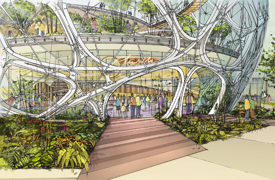 Дизайнером проекта является известное архитектурное бюро NBBJ. Экоцентр будет оборудован рабочими офисами, торговыми точками, конференц-залами, местами отдыха, но главным достоянием, бесспорно, будет атриум из редких растений и деревьев со всего мира, создающих максимально комфортный для человека микроклимат. Таким образом, будущая штаб-квартира Amazon будет не только местом для 2 тыс. сотрудников компании, но и общественным местом, где каждый желающий сможет приятно провести время. Окончание строительства проекта запланировано на конец 2016 года.