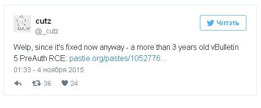 К тому же, вчера вечером (3 ноября 2015 года) некто cutz опубликовал в открытом доступе подробный анализ бага трехлетней давности, который позволял удаленно исполнить любой произвольный код на сайтах работающих с платформой vBulletin. Исследователь пишет: «Ну, раз этот баг уже исправлен — vBulletin 5 PreAuth RCE трехлетней давности».