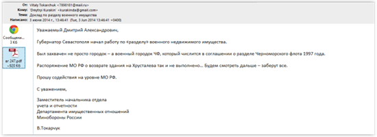 В одном из писем чиновники жалуются, что «самооборона» захватила целый городок, принадлежащий Черноморскому флоту РФ. «Губернатор Севастополя начал работу по разделу военного недвижимого имущества. Был захвачен не просто городок — а военный городок ЧФ, который числится в соглашении о разделе Черноморского флота 1997 года. Будем смотреть дальше — заберут все. Прошу содействия на уровне МО РФ», — пишет в докладной записке начальству российский интендант Дмитрий Токарчук.