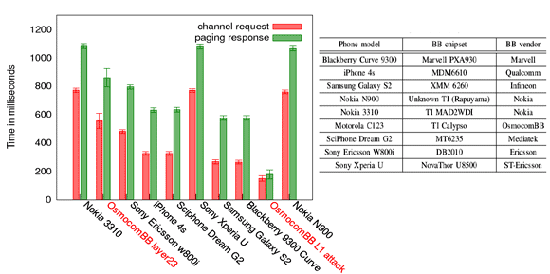 Один телефон способен отвечать примерно на 1 запрос в секунду. По оценке авторов, всего 11-ти взломанных аппаратов достаточно, чтобы блокировать сотовую связь в сети мелкого оператора в городе вроде Берлина (660 запросов в минуту). Благодаря сделанным модификациям, телефоны с самодельной прошивкой OsmocomBB отвечают на запросы базовой станции быстрее всех. На графике показана скорость ответа на запросы аппаратов разных производителей с разными чипсетами BB.