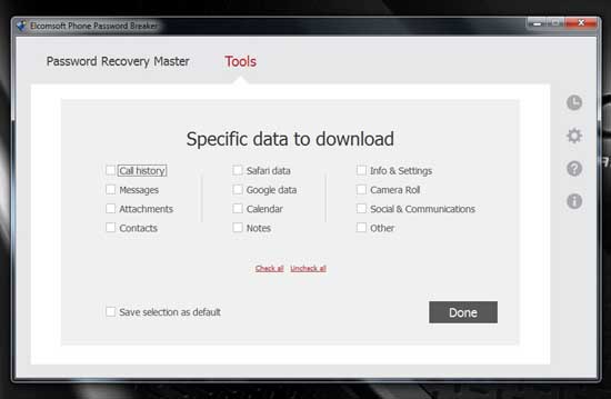 После того, как Phone Password Breaker подберет пароль, открывается окно, в котором можно выбрать, какие типы данных следует сохранить: история звонков и сообщений, список контактов, заметки, фотографии и видео и так далее. Уоррен признается, что у нее был очень простой пароль, поэтому программа быстро его подобрала.